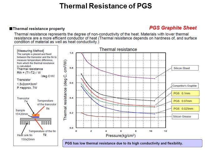 A common question asked when applying the PGS material is "How much pressure should be applied to the material during installation?" This is a difficult question to answer because there is no one right answer. Every application and/or heat transfer requirement is different; therefore, there are some instances where a great amount of pressure will need to be applied and there are other cases where only a small amount of pressure is needed to get that ideal heat transfer. With that being said, the best response to this question is the thermal resistance data. The graph here shows how the thermal resistance of PGS changes based on the amount of pressure applied. By understanding the thermal resistance, the thermal conductivity can be better understood, and in turn, an idea on the amount of heat transfer can be predicted.