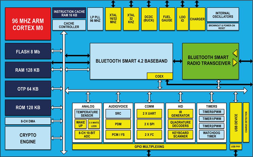 בתמיכה בליבת המפרטים של ה- Bluetooth 4.2, הפתרון המשולב ביותר הזה, מציע את הגמישות לפיתוח מערכות לבישות ונטענות שהצרכנים יאהבו. הוא יכול לנהל מערכים מרובי חיישנים ולאפשר חישה במצב מופעל-תמיד, תוך התאמת הביצועים שלו לצרכים של אפליקציות הנדרשים בכול זמן נתון לחסוך באנרגיה. פשוט לתכנון ומסופק עם תמיכה נרחבת, הוא מאפשר למשתמשים לפתח בקלות התקנים לבישים מרובי חיישנים בהקשר מודע, הפועלים לפרקי זמן ארוכים בין טעינות מחדש.